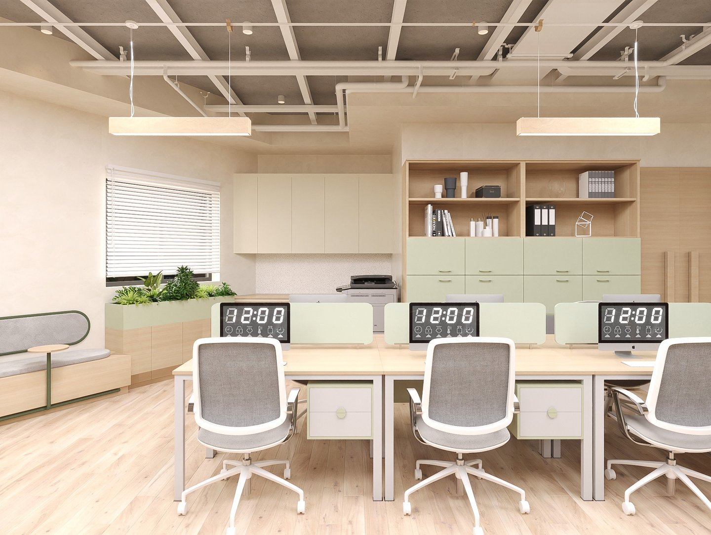 Màu sắc hài hòa: Sự kết hợp giữa xanh mint và gỗ sồi không chỉ tạo nên vẻ đẹp thẩm mỹ mà còn mang lại cảm giác thư giãn, giúp tăng hiệu quả làm việc.