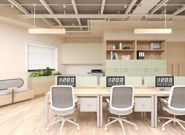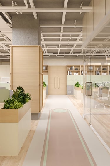 Văn phòng được thiết kế theo concept không gian văn phòng mở, tạo sự kết nối linh hoạt giữa các khu vực làm việc, khuyến khích sự tương tác và sáng tạo giữa nhân viên. Tông màu chủ đạo là xanh mint và gỗ sồi sáng, mang lại cảm giác tươi mới, thân thiện và gần gũi với thiên nhiên.