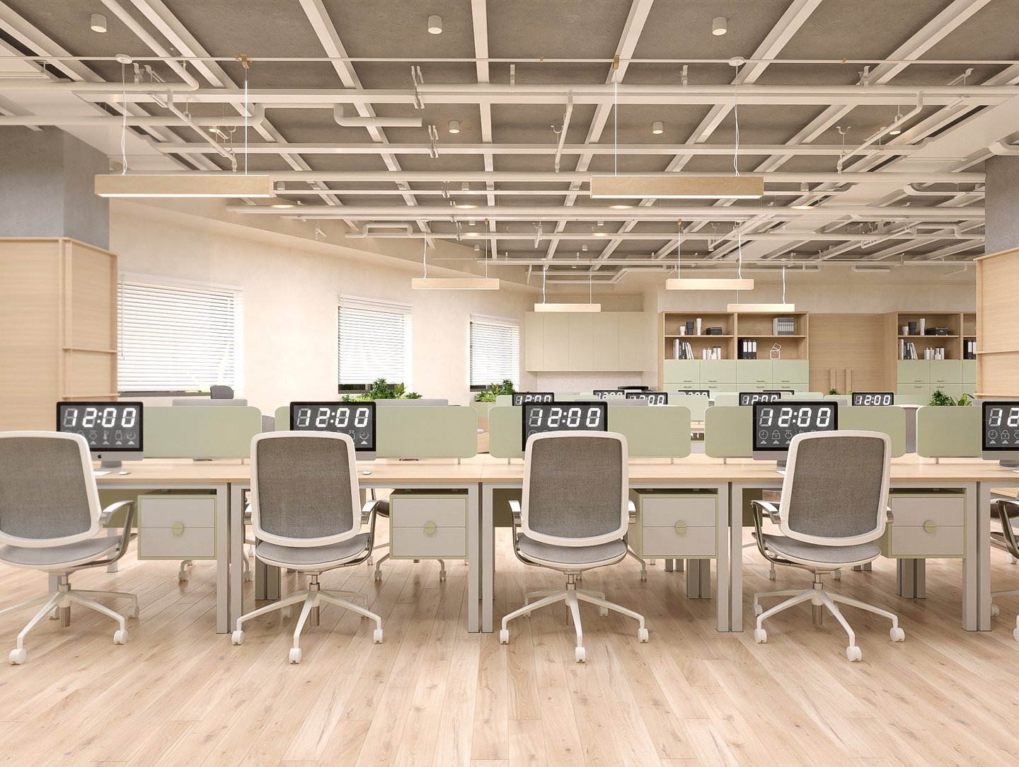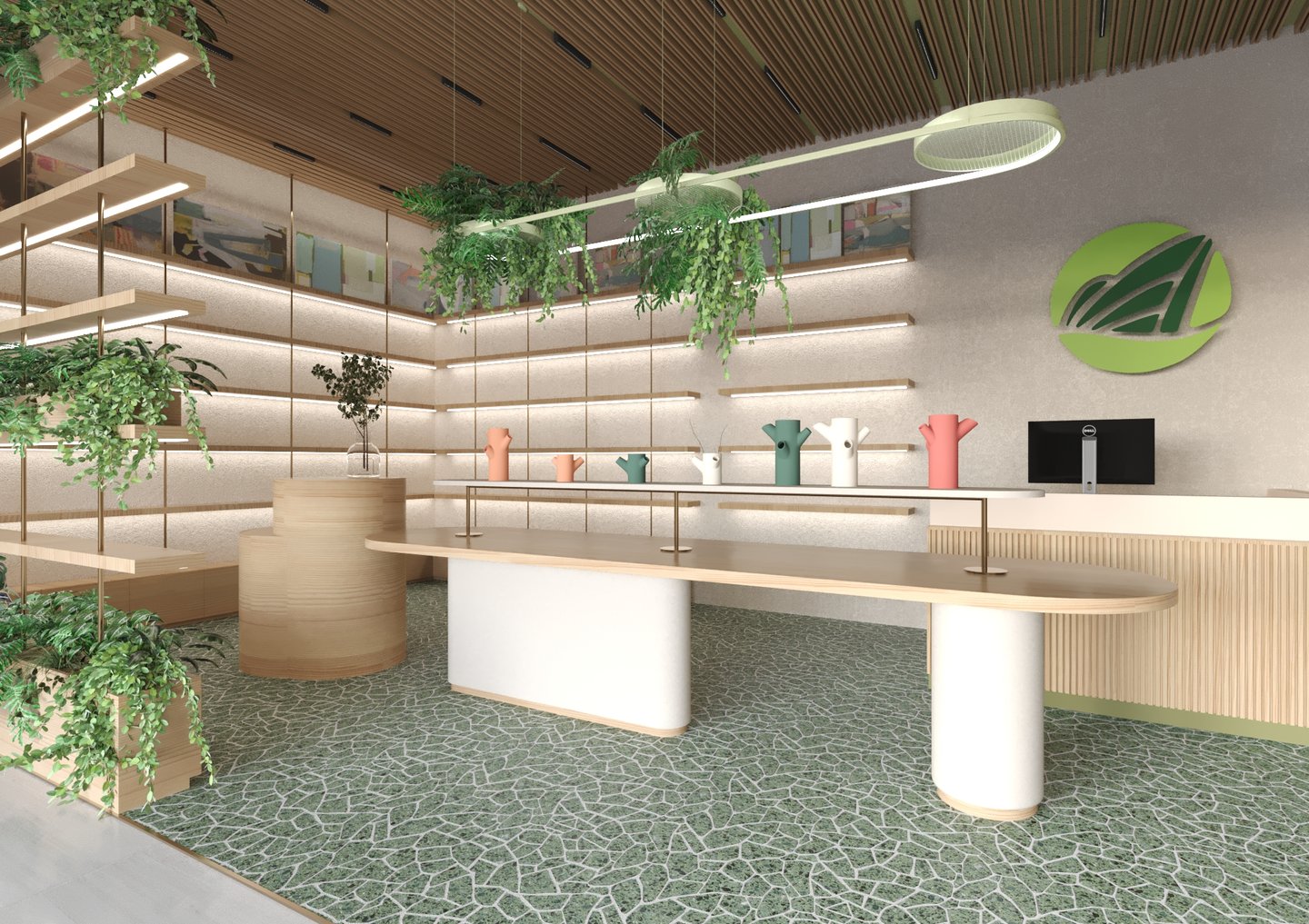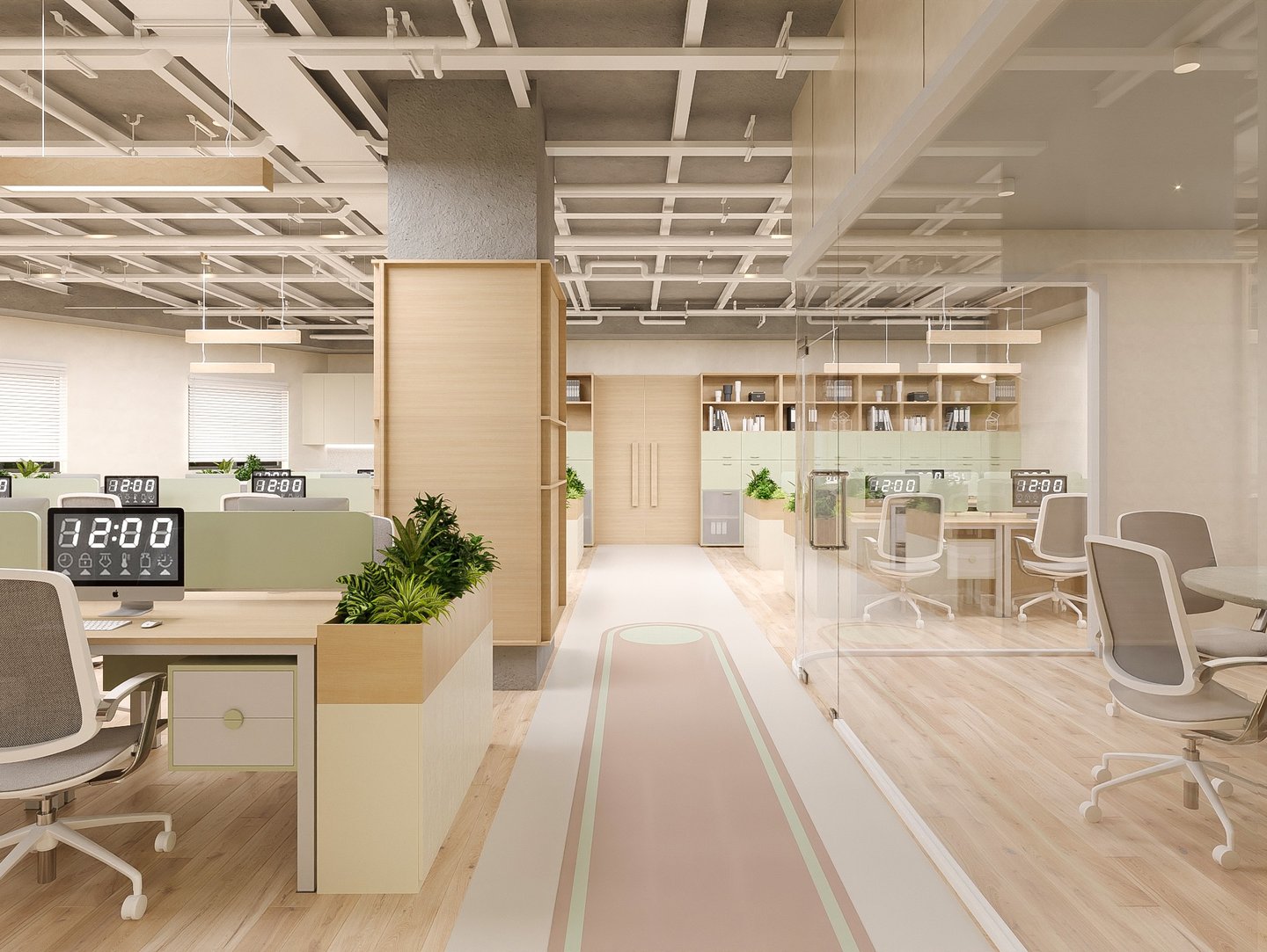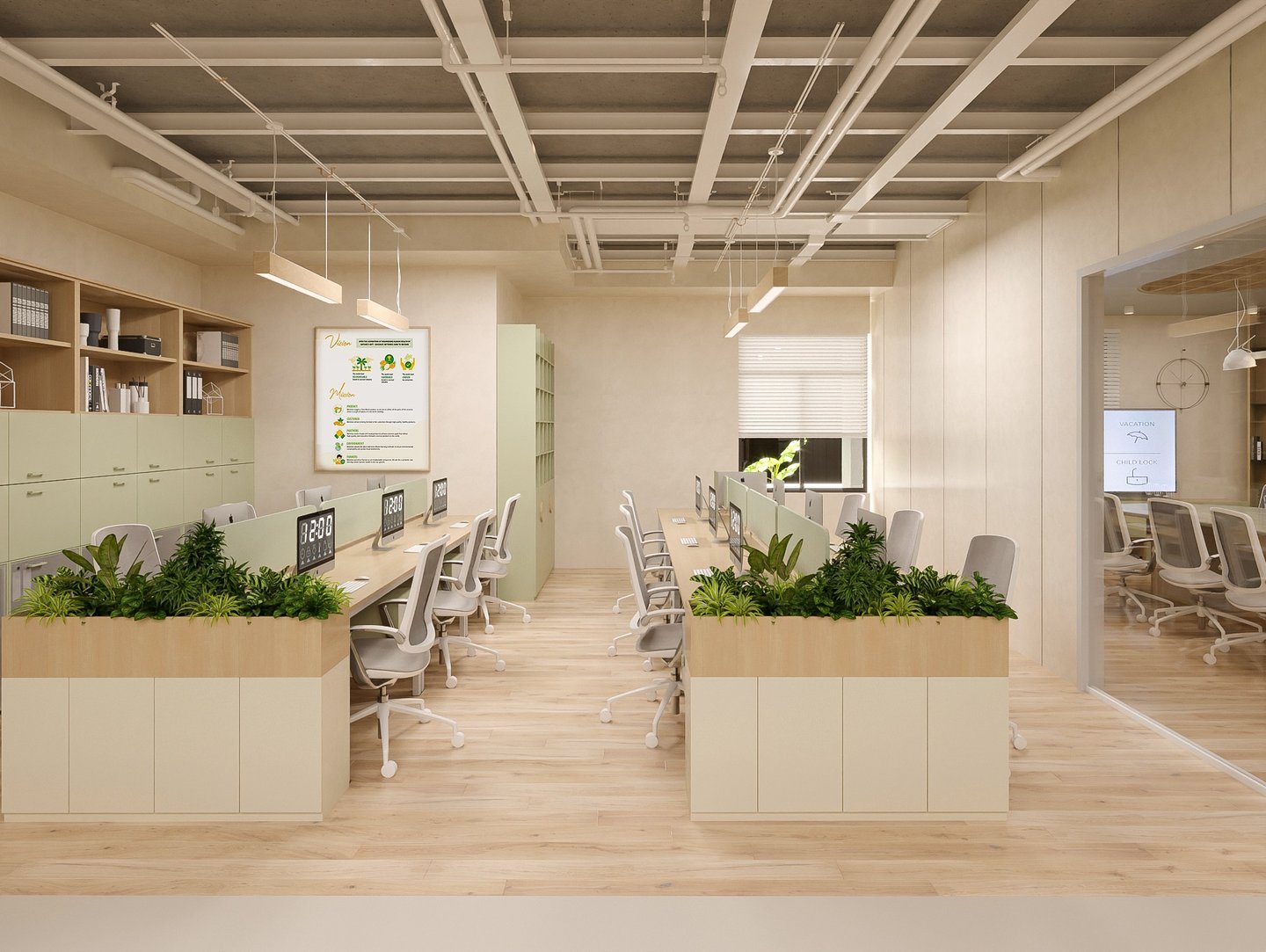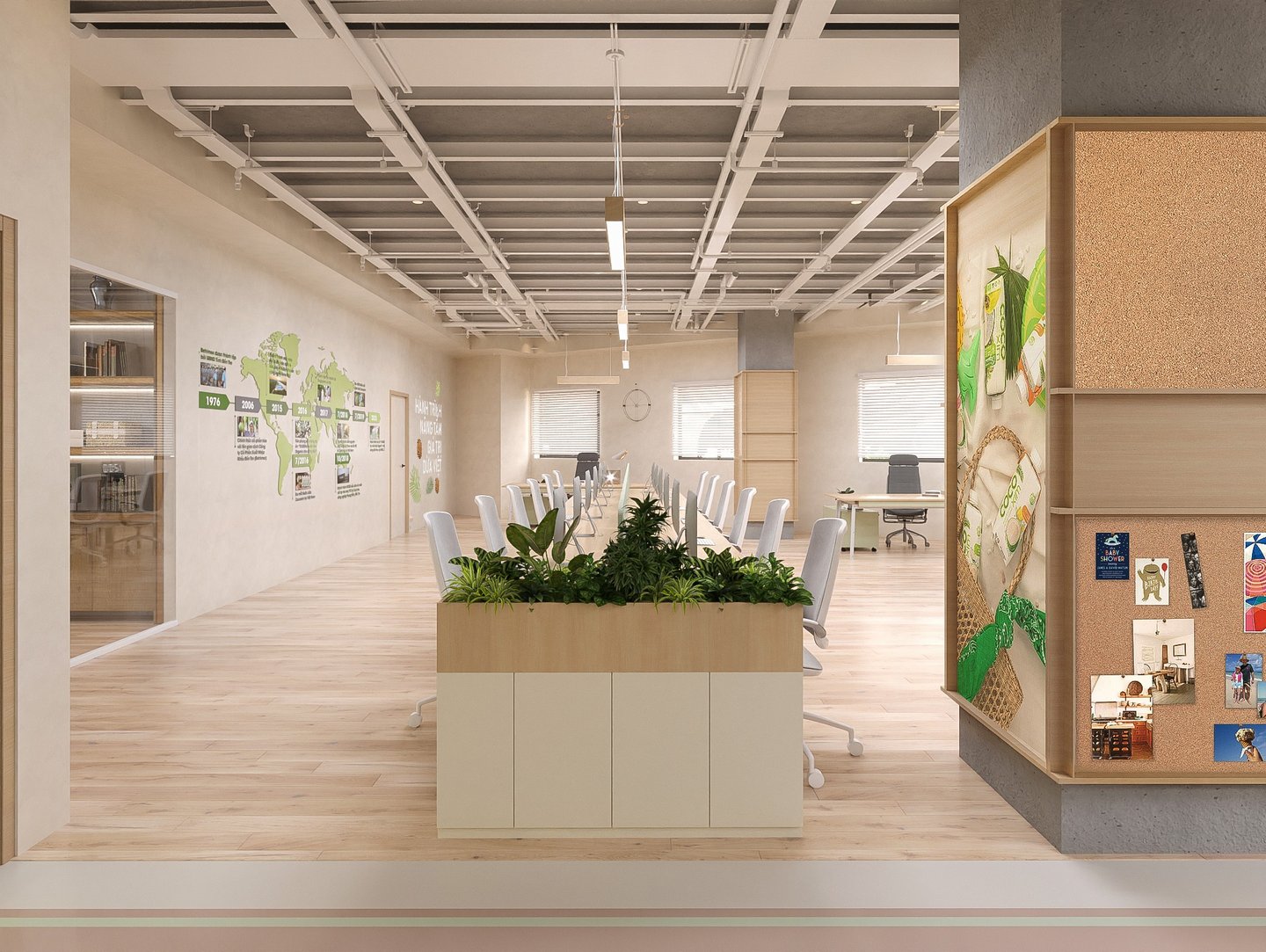 Văn phòng được thiết kế theo concept không gian văn phòng mở, tạo sự kết nối linh hoạt giữa các khu vực làm việc, khuyến khích sự tương tác và sáng tạo giữa nhân viên. Tông màu chủ đạo là xanh mint và gỗ sồi sáng, mang lại cảm giác tươi mới, thân thiện và gần gũi với thiên nhiên.