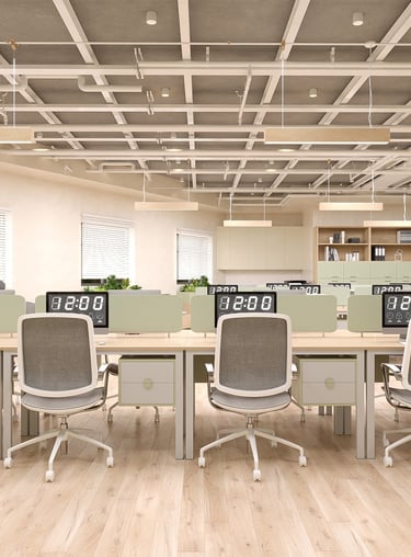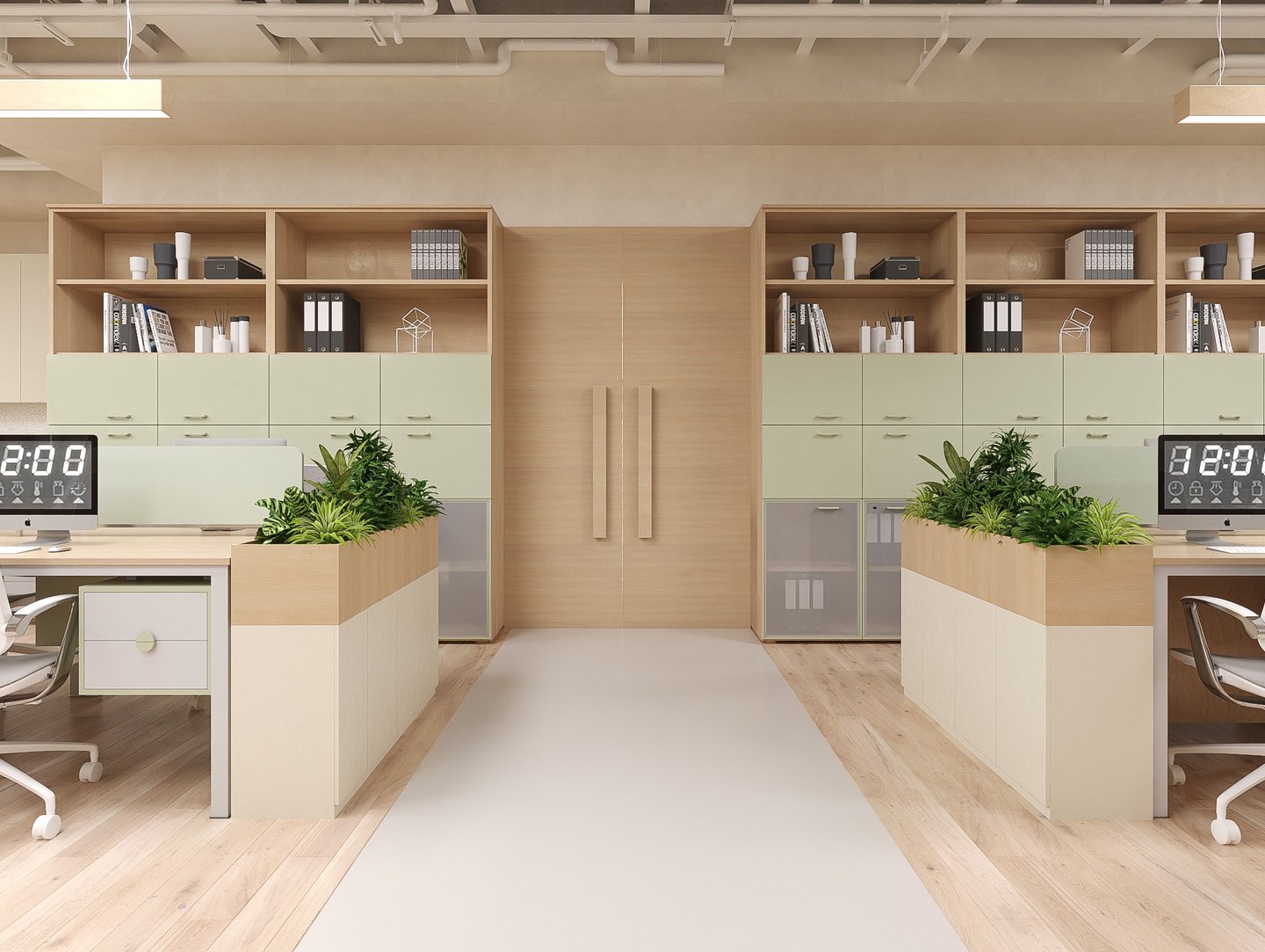 Màu sắc hài hòa: Sự kết hợp giữa xanh mint và gỗ sồi không chỉ tạo nên vẻ đẹp thẩm mỹ mà còn mang lại cảm giác thư giãn, giúp tăng hiệu quả làm việc.