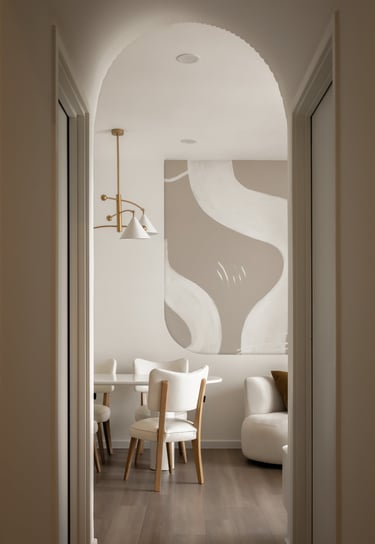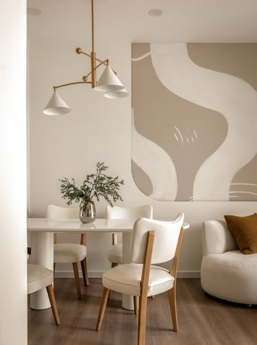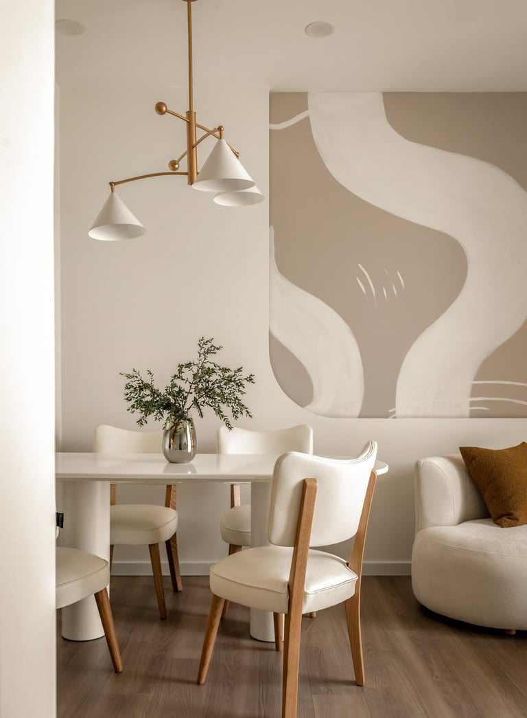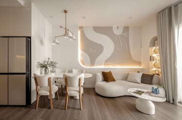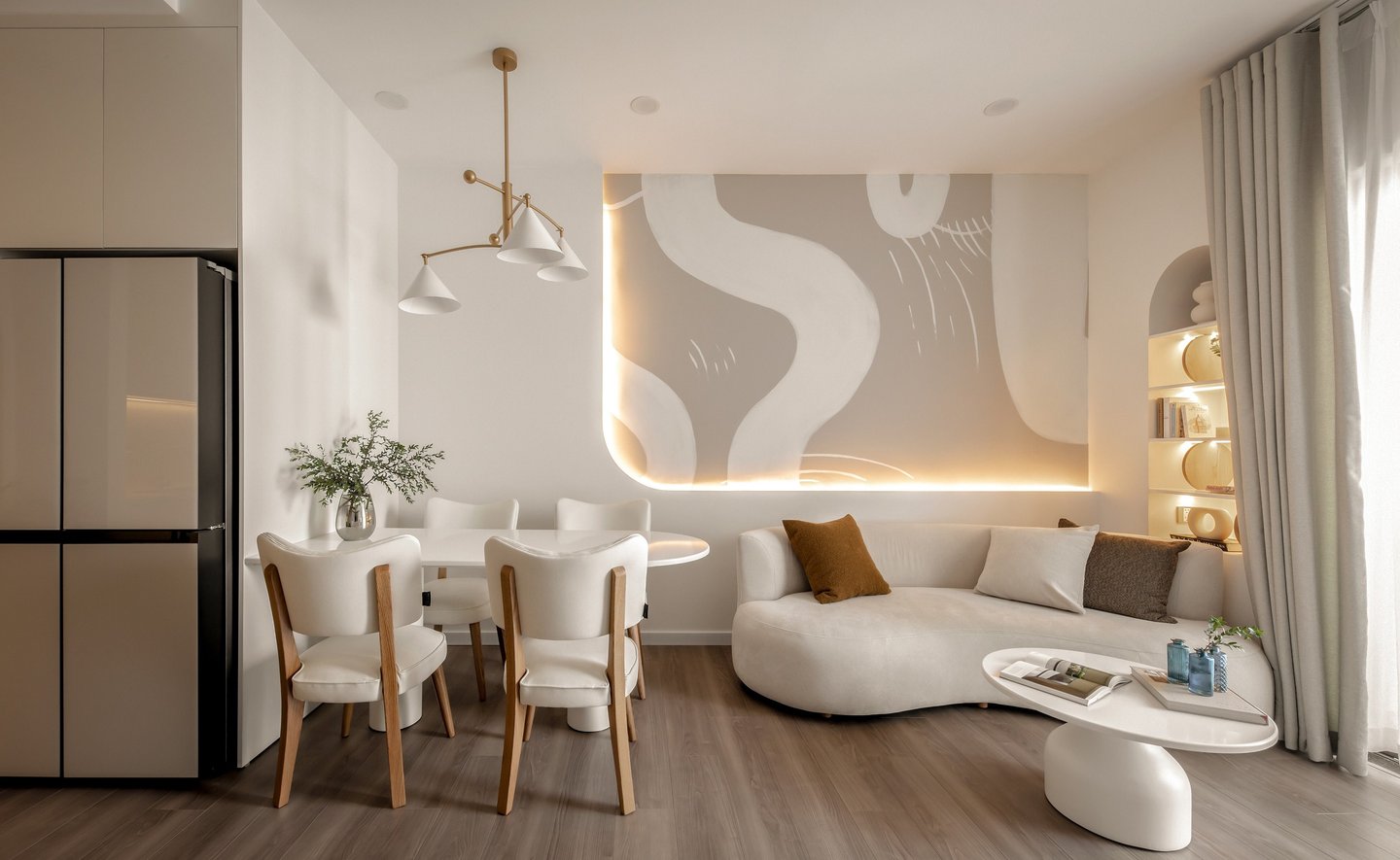 Đúng với tinh thần Bắc Âu, căn hộ sử dụng tone trắng chủ đạo, kết hợp với màu be, xám nhạt và sắc nâu gỗ ấm áp, tạo nên không gian hài hòa, thanh thoát mà không hề đơn điệu. Sự chuyển đổi tinh tế giữa các gam màu giúp căn hộ vừa nhẹ nhàng, vừa có chiều sâu.