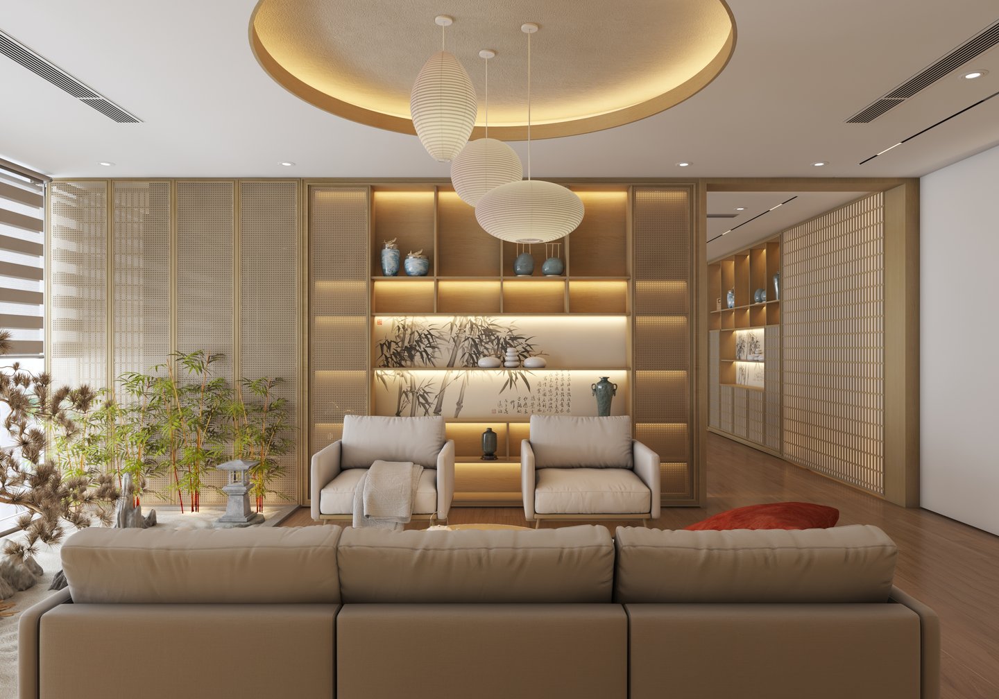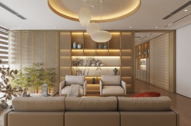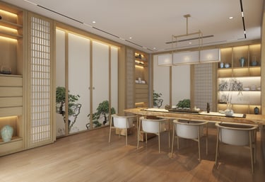 Khu vực thư giãn – tiếp khách mang phong cách Nhật với bàn trà gỗ thấp, đệm ngồi, ánh đèn vàng ấm áp tạo sự gần gũi, thân thiện.