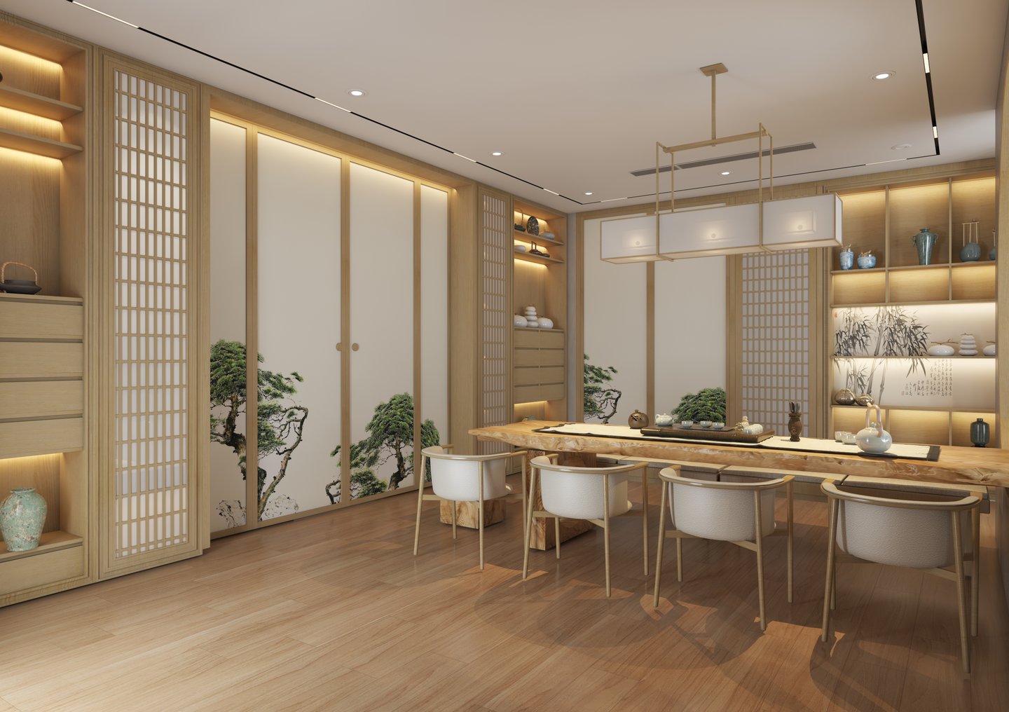 Văn phòng được điểm xuyết bằng cây xanh lá nhỏ, bonsai, hoặc bình cắm ikebana giúp thanh lọc không khí, tạo sự thư thái.